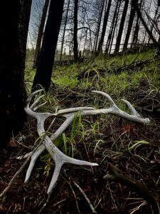 I contemplate the eons of antler evolution that formed its current shape – how elk and other cervids evolved to grow antlers purely as manifestations of their physical health and genetic prowess. Big, symmetrical antlers show cow elk what robust and healthy genetic specimens a bull is. Each specific elk’s antler is unique to that particular animal and individual points grow in the same specific configuration each year.