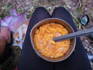 One way to start hiking earlier is to give up on cooking breakfast. Usually for breakfast, I have cereal, muesli, or granola with powdered milk. By weighing cereal and powdered milk together in a ziplock, all you need to do is combine this in your pot with water. Most cereals pack enough calories per gram or ounce, but if I have to fit 8 or more day’s worth of food in my Bearvault then I reach for calorically dense cereals like grape nuts or a nut-rich muesli. I treat myself to a hot oatmeal serving from the brand YiShi (at Sprouts) because I enjoy their unusual flavors, and most flavors have some caffeine in them. Within Albuquerque, I have found powdered low-fat milk, and powdered oat milk can be found online at Hoosier Hill Farm. They sell other powdered milk and ingredients perfect for backpackers, and shipping is free. I skip hot coffee as well. There are chocolate bars and caffeine-infused drink concentrates I pack to avoid a caffeine withdrawal headache.