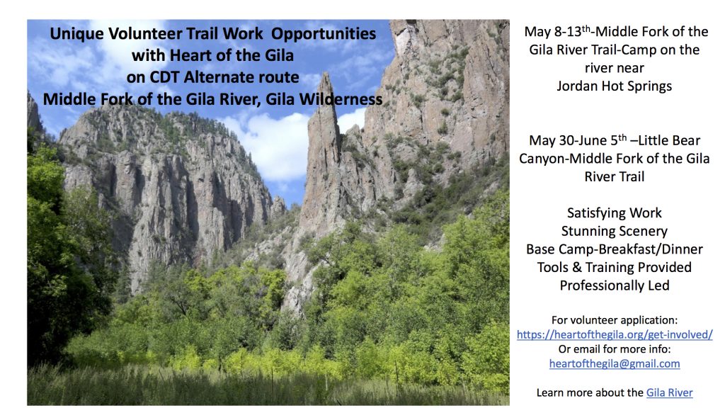 New Mexico Wild Wilderness Rangers are collaborating with Heart of the Gila on upcoming trail work opportunities on the Continental Divide Trail Alternate Route. These are great volunteer opportunities!